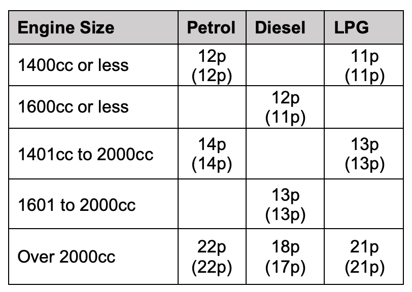 Where the employer does not pay for any fuel for the company car, these are the amounts that can be reimbursed in respect of business journeys without the amount being taxable on the employee.