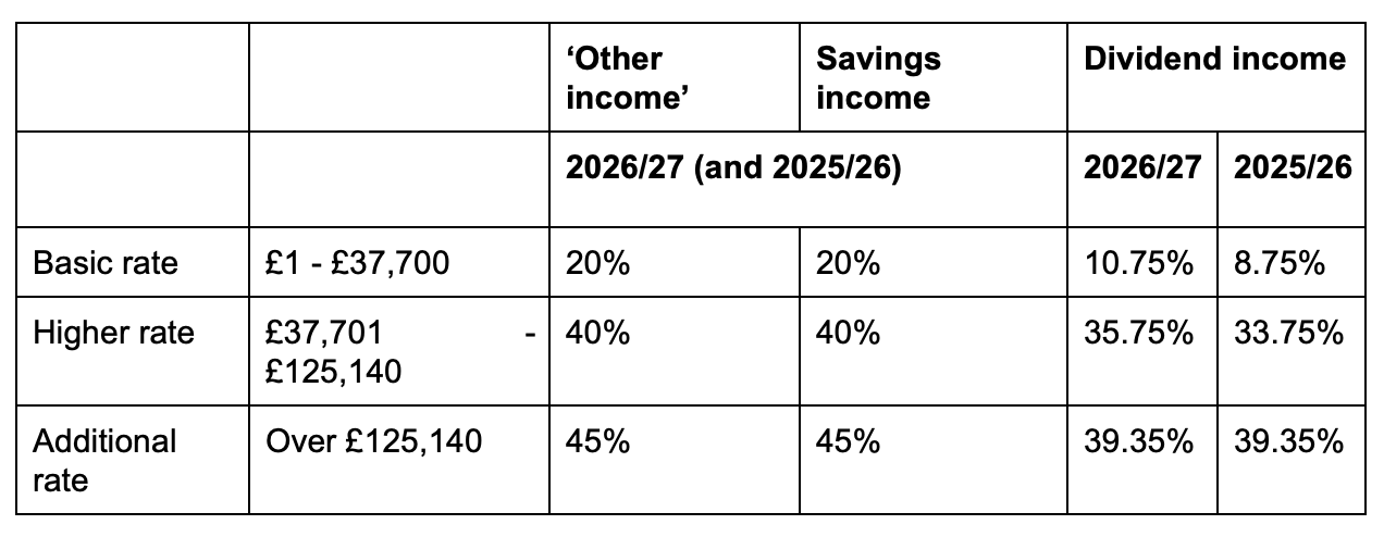 For 2026/27, the income tax thresholds are unchanged from 2025/26 and are set to remain static until 2030/31. The only rates that will increase from 6 April 2026 are the basic and higher tax rates on dividend income.