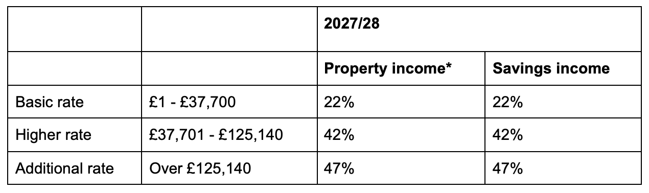 From 6 April 2027, the government will create separate income tax rates for property income and will increase the income tax rates on savings income as follows: