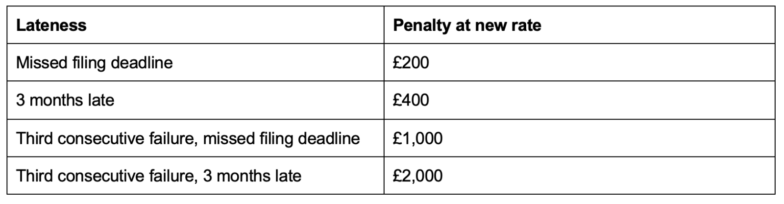Another key corporation tax change is the new penalty amounts applicable to late-filed corporation tax returns. For returns with a due date that is on or after 1 April 2026, the penalties are: